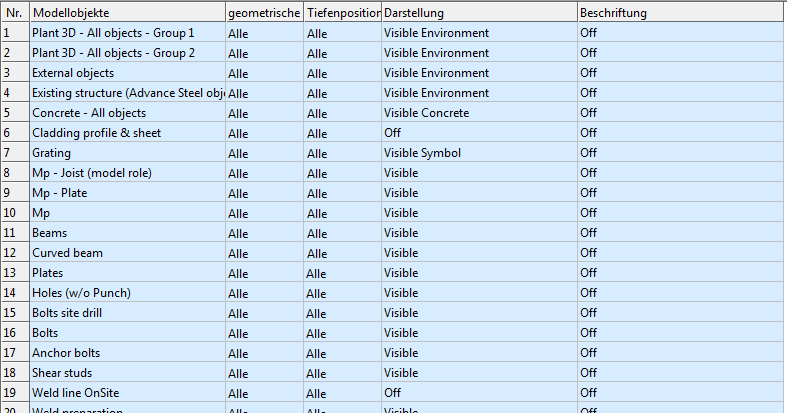Zum Anpassen der richtigen Beschriftungsvorschrift in der Zeichnungsstilkonfiguration basierend auf einer Benutzeranforderung müssen sie die Objektdarstellungsregel ändern, nachdem Sie die entsprechende Zeile ermittelt haben. Damit Sie die Zeile bestimmen können, müssen Sie das eigentliche Objekt, seinen Typ und seine Rolle kennen. Sie müssen wissen, ob es ein Hauptteil in einer Baugruppe oder ein Anbauteil ist, ob es ein Träger, ein Blech, ein Kantträger oder ein Kantblech ist, ob es von vorne, oben oder der Seite dargestellt wird oder isometrisch ist und ob es eine bestimmte Modellrolle im 3D-Modell einnimmt.