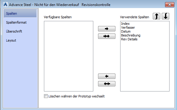 Verfügbare Spalten Zeigt die Liste der Spalten an, die in der Revisionstabelle dargestellt werden können.