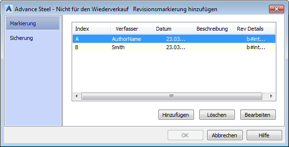 | Bearbeiten | Ermöglicht das Ändern der Revisionsinformationen im Dialogfeld Revisionsmarkierung. |