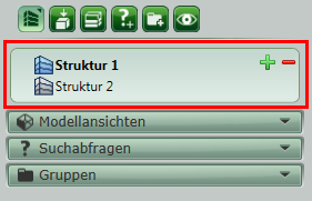 Zeigt die Liste der bestehenden Strukturen an. Durch das Aktivieren einer Struktur werden alle Modellansichten deaktiviert und die gesamte Konstruktion wird in 3D angezeigt. Sie können ohne Einschränkungen in 3D arbeiten.