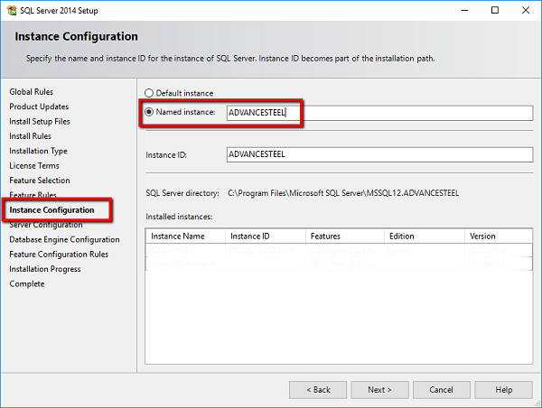 - Wenn Sie während der Installation eine neuen Instanz im Abschnitt Instanzkonfiguration erstellen, geben Sie dieser im Feld Benannte Instanz einen aussagekräftigen Namen, z. B. „ADVANCESTEEL“.