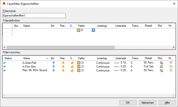 Für die Verwaltung von größeren Layer-Sätzen können Sie Layer-Filter erstellen. Im Layereigenschaften-Manager können Sie drei Typen von Layer-Filtern erstellen: Gruppenfilter, Eigenschaftenfilter und Layer-Standardsfilter. Eigenschaftenfilter gruppieren die Layer auf der Grundlage der Layer-Eigenschaften und Status wie z. B. Sichtbarkeit oder Farbe. Die Gruppenfilter enthalten alle darin abgelegten Layer. Standardsfilter enthalten Layer, die einer bestimmten Layer-Standardskategorie zugewiesen sind.