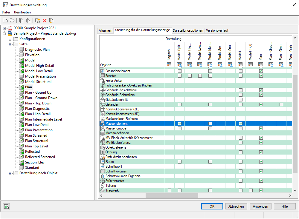 | Hinzufügen einer Darstellung für ein Objekt zu dem Darstellungssatz | Blättern Sie durch die Liste, um das Objekt zu finden. Wählen Sie die zu verwendende Darstellung. Wenn unter einer Darstellung kein Kontrollkästchen angezeigt wird, verfügt das Objekt nicht über diese Darstellung. |