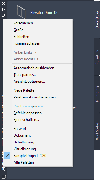 Gehen Sie wie folgt vor, um die projektspezifische Palettengruppe im Werkzeugpalettensatz anzuzeigen.