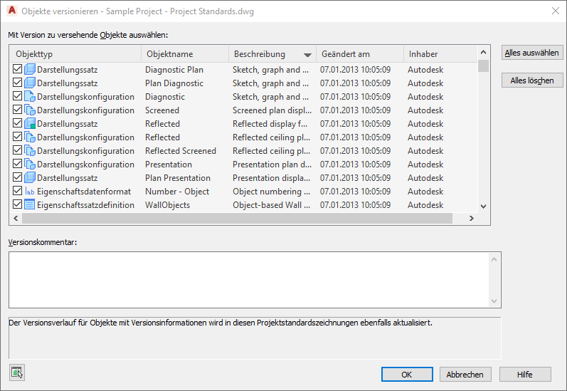 Dieser Kommentar gilt für alle Objekte, die für die Versionierung ausgewählt wurden.