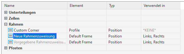Gehen Sie wie folgt vor, um einer Tür-Fenster-Kombination eine Rahmenzuweisung hinzuzufügen. Um verschiedenen Rahmenkanten verschiedene Definitionen zuzuweisen, benötigen Sie mehrere Rahmenzuweisungen.