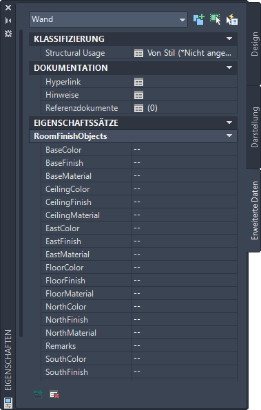 Anmerkung: Die Liste der Eigenschaften auf der Registerkarte Erweiterte Daten können Sie mithilfe der Optionen in der Dropdown-Liste Eigenschaftenüberschreibung auf der Registerkarte mit den AEC-Objekteinstellung im Dialogfeld Optionen steuern.