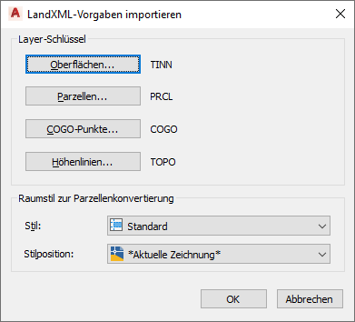 Wenn Sie keine bestimmten Layer-Schlüssel für die LandXML-Daten definieren, werden die importierten Daten den für LandXML-Daten, TINN (Oberflächen), PRCL (Parzellen), COGO (COGO-Punkte) und TOPO (Höhenlinien) vorgegebenen Layer-Schlüsseln zugeordnet.