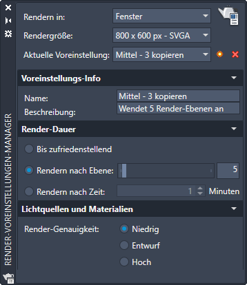 Verwenden Sie den Render-Voreinstellungs-Manager zum Angeben der primären Einstellungen für das Rendern. Sie können auch mit Hilfe der Steuerelemente auf der Multifunktionsleiste einige allgemeine Render-Einstellungen ändern oder eine benannte Render-Voreinstellung als aktuell festlegen.
