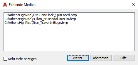 Dieses Dialogfeld wird angezeigt, wenn Sie versuchen, eine Szene mit Textur-Maps zu rendern, deren Pfad nicht mehr aktuell ist. Dies kann vorkommen, wenn Textur-Maps verschoben oder gelöscht wurden oder wenn die Zeichnungsdatei auf einen Computer mit anderen Laufwerkzuordnungen verschoben wurde.
