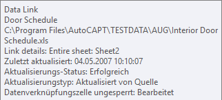 Wenn eine Zeichnung mit einer Datenextraktionstabelle in AutoCAD LT geöffnet wird, zeigt der QuickInfo-Text an, dass die Tabelle extrahierte Daten enthält. Sie können die extrahierten Daten nicht aktualisieren und keine Datenverknüpfungen (falls vorhanden) ändern.
