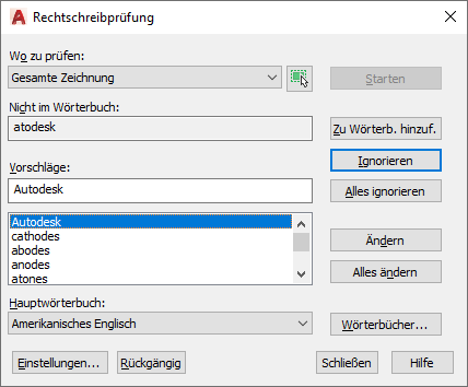 Prüft die Rechtschreibung für einzeiligen und mehrzeiligen Text, Multiführungslinien-Text, Text in Blockattributen, Text in Xrefs und zu Bemaßungen hinzugefügten Text.