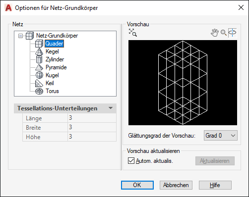 Gibt den zu ändernden Netz-Grundkörper an. Wählen Sie einen Grundkörpertyp (z.B. Quader oder Kegel) aus, dessen Einstellungen Sie unter Tessellationsunterteilungen anzeigen möchten.
