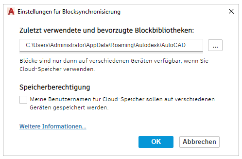 Steuert die Berechtigung zum Speichern des Benutzernamens für den Cloud-Speicher für alle Geräte. Die Auswahl dieser Option bietet geräteübergreifend ein individuelleres Benutzererlebnis beim Zugriff auf die zuletzt verwendeten und bevorzugten Blöcke.