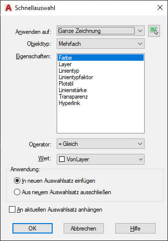 Wenn die Option An aktuellen Auswahlsatz anhängen gewählt ist, werden die Filterkriterien auf die gesamte Zeichnung angewendet.
