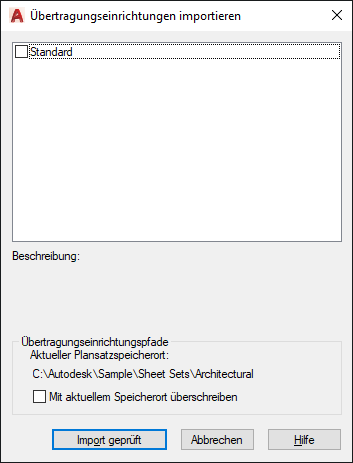 Zeigt eine Liste der Übertragungseinrichtungen an. Markieren Sie Übertragungseinrichtungen, die importiert werden sollen, in den aktuellen Plansatz.