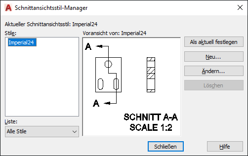 Zeigt eine Liste der Schnittansichtsstile an, die in der aktuellen Zeichnungsdatei verfügbar sind. Der aktuelle Stil ist markiert.