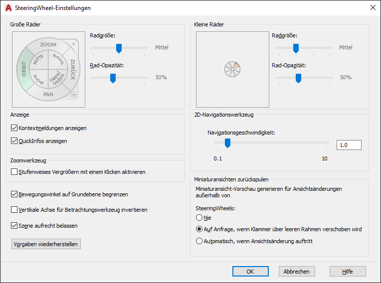 Wendet die Vorgabeeinstellungen für die SteeringWheels an.