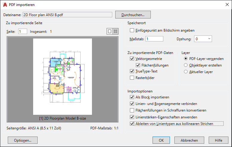 Erstellt AutoCAD-Layer für jeden der folgenden allgemeinen Typen von Objekten, die aus der PDF-Datei importiert wurden: PDF_Geometry, PDF_Solid Fills, PDF_Images und PDF_Text.