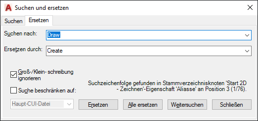 Anmerkung: Sie können das Ersetzen einer Zeichenfolge nicht rückgängig machen. Wenn Sie einen Fehler machen, schließen Sie das Dialogfeld Suchen und Ersetzen, beenden Sie den CUI-Editor, und versuchen Sie es erneut.