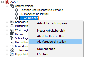 Arbeitsbereiche in einer CUIx-Datei können als Vorgabe markiert werden. Durch die Festlegung eines Arbeitsbereichs als Vorgabe wird bestimmt, dass dieser Arbeitsbereich wiederhergestellt werden soll, wenn die CUIx-Datei erstmals in das Programm geladen wird bzw. nachdem die CUIx-Datei mit dem Befehl ABILAD geladen wurde.