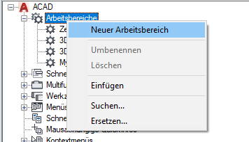2. Klicken Sie auf der Registerkarte Anpassen im Bereich Anpassungen in <Dateiname> mit der rechten Maustaste auf den Knoten Arbeitsbereiche, und wählen Sie Neuer Arbeitsbereich aus.