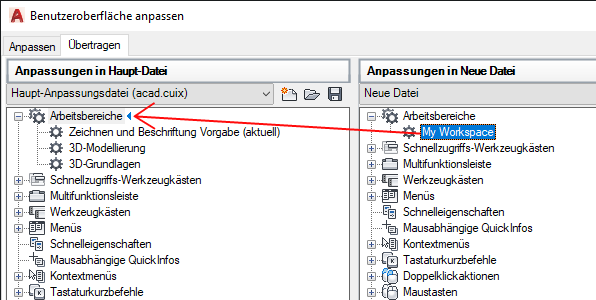 4. Ziehen Sie im Bereich Anpassungen in <Dateiname> (rechte Seite) den Arbeitsbereich aus der CUIx-Datei auf den Knoten Arbeitsbereiche der Haupt-CUIx-Datei im Bereich Anpassungen in <Dateiname> (linke Seite).