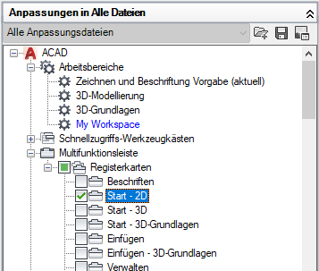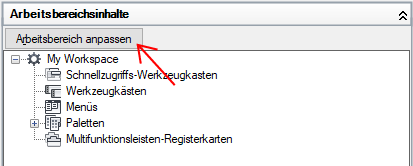 2. Klicken Sie auf der Registerkarte Anpassen im Bereich Anpassungen in <Dateiname> auf das Pluszeichen (+) neben dem Knoten Arbeitsbereiche, um ihn zu erweitern.