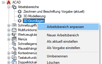 Anmerkung: In AutoCAD können im Netzwerkeinrichtungsassistenten die Haupt- und Unternehmens-CUIx-Dateien angegeben werden. Wenn für die Haupt-CUIx-Datei ein Vorgabe-Arbeitsbereich festgelegt wurde, wird dieser als aktueller Arbeitsbereich eingestellt, wenn die Datei zum ersten Mal geladen wird.