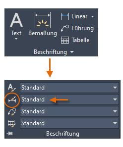 Der Name des aktuellen Bemaßungsstils, in diesem Fall Hitchhiker, wird auch in der Dropdown-Liste der Gruppe Beschriften angezeigt.