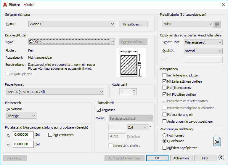 Jeder Layout-Registerkarte in der Zeichnung kann eine Seiteneinrichtung zugeordnet werden. Dies ist hilfreich, wenn Sie mehrere Ausgabegeräte oder -formate verwenden, oder wenn Sie über mehrere Layouts mit verschiedenen Größen in derselben Zeichnung verfügen.