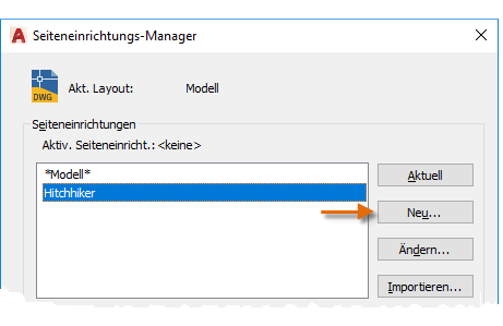 Um den Seiteneinrichtungs-Manager zu öffnen, klicken Sie mit der rechten Maustaste auf die Registerkarte Modell oder eine Layout-Registerkarte und wählen Seiteneinrichtungs-Manager aus. Der Befehl lautet SEITENEINR.