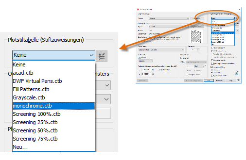 Die Plotstiltabelle enthält Informationen zur Verarbeitung von Farben. Farben, die zwar auf dem Monitor optimal angezeigt werden, sind möglicherweise nicht für PDF-Dateien oder zum Drucken geeignet. Möglicherweise möchten Sie eine farbige Zeichnung, jedoch eine monochrome Ausgabe erstellen. So legen Sie eine monochrome Ausgabe fest: