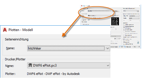 Um Ihnen die Arbeit zu erleichtern, können Sie Sammlungen dieser Einstellungen speichern und unter Verwendung der entsprechenden Namen wiederherstellen. Diese Sammlungen werden als Seiteneinrichtungen bezeichnet. Mit Seiteneinrichtungen können Sie die Einstellungen speichern, die Sie für verschiedene Drucker, das Drucken in Graustufen, das Erstellen von PDF-Dateien aus Zeichnungen usw. benötigen.