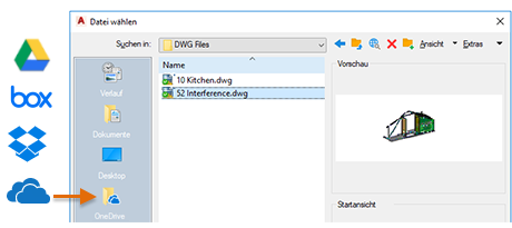 Wenn Sie über ein Konto bei einem Cloud-Speicheranbieter verfügen, können Sie es der Leiste Speicherorte in den AutoCAD-Dialogfeldern zur Dateiauswahl hinzufügen, um direkt zu den Zeichnungen in Ihrem Cloud-Speicherkonto zu navigieren. Klicken Sie einfach mit der rechten Maustaste in die Leiste der Speicherorte, und geben Sie einen Namen und Pfad für die Navigationsverknüpfung ein.