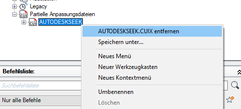 3. Klicken Sie mit der rechten Maustaste auf die partielle CUIx-Datei, die Sie entfernen möchten. Klicken Sie auf Entfernen <Anpassungsgruppenname>.