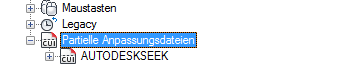 Anmerkung: Falls die partielle CUIx-Datei, die Sie laden möchten, denselben Anpassungsgruppennamen wie die Haupt-CUIx-Datei hat, müssen Sie den Anpassungsgruppennamen vor dem Laden ändern. Öffnen Sie die partielle CUIx-Datei im CUI-Editor, wählen Sie den Namen der Anpassungsgruppe aus, und klicken Sie mit der rechten Maustaste hierauf, um diese umzubenennen.