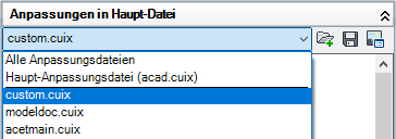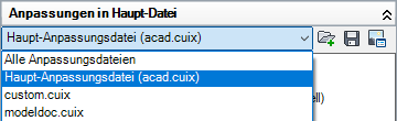 1. Wählen Sie auf der Registerkarte Anpassen im Bereich Anpassungen in <Dateiname> die Haupt-CUI-Datei (<Anpassungsdateiname>.cuix) aus der Dropdown-Liste aus.