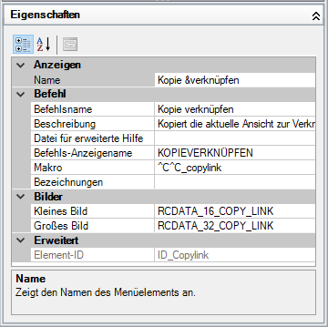 Die Tilde (~) und das Ausrufezeichen, gefolgt von einem Punkt (!.) werden vor die Befehlsbeschriftung Kopie verknüpfen (Eigenschaft Name des Bereichs Eigenschaften) gesetzt. Es folgt eine Darstellung des Befehls Kopie verknüpfen, der im Menü Bearbeiten markiert und grau abgeblendet ist.