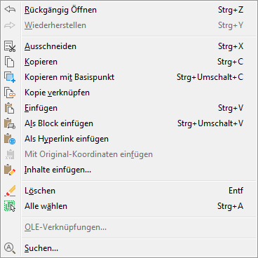 Das folgende Beispiel zeigt das Menüelement OLE-Verknüpfungen im Menü Bearbeiten, das durch ein Häkchen markiert ist, sowie das Bild des Menüelements Kopie verknüpfen, das durch einem Rand hervorgehoben ist.
