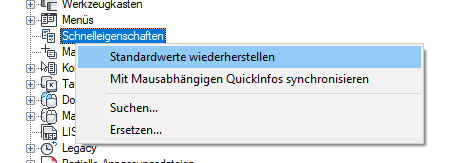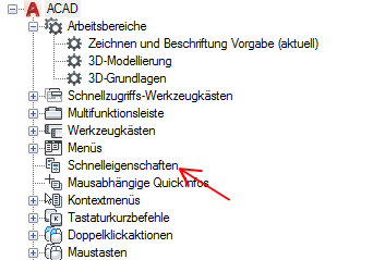 - Wählen Sie auf der Registerkarte Anpassen im Bereich Anpassungen in <Dateiname> die Option Schnelleigenschaften.