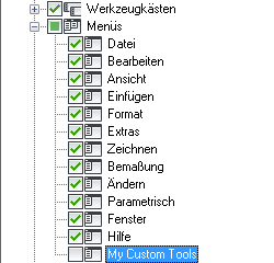 - Klicken Sie im Bereich Anpassungen in <Dateiname> auf das Pluszeichen (+) neben dem Knoten Menüs, um ihn zu erweitern.