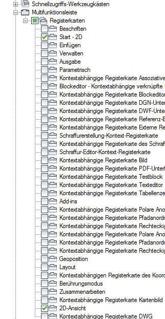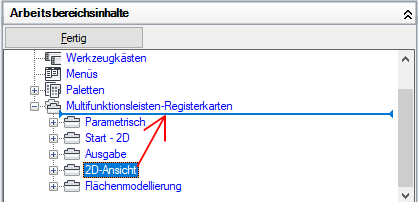 - Klicken Sie im Bereich Arbeitsbereichsinhalte auf das Pluszeichen (+) neben dem Knoten Multifunktionsleisten-Registerkarten, um ihn zu erweitern.