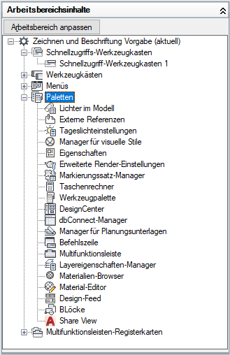 - Klicken Sie im Bereich Arbeitsbereichsinhalte auf das Pluszeichen (+) neben dem Knoten Paletten, um ihn zu erweitern.