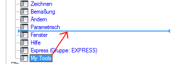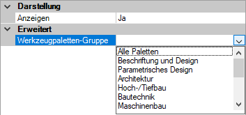 - Wählen Sie im Feld Werkzeugpaletten-Gruppe eine der aufgeführten Werkzeugpalettengruppen aus, um sie der Multifunktionsleisten-Registerkarte zuzuordnen.