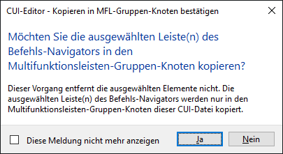 - Klicken Sie im Dialogfeld CUI-Editor - Kopieren in Multifunktionsleisten-Gruppen-Knoten bestätigen auf Ja.