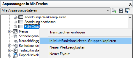 - Klicken Sie mit der rechten Maustaste auf den Werkzeugkasten, den Sie kopieren und in eine Multifunktionsleisten-Gruppe möchten. Klicken Sie auf In Multifunktionsleisten-Gruppen kopieren.