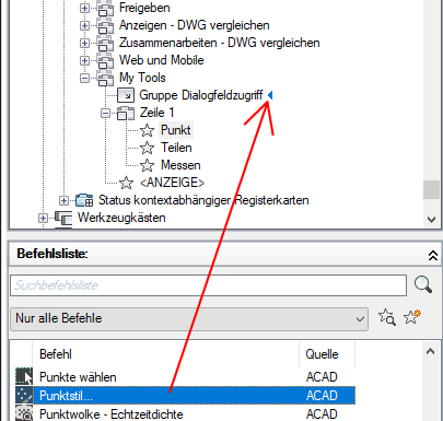 - Ziehen Sie einen Befehl aus der Befehlsliste auf die Option Gruppe Dialogfeldzugriff in der Gruppe.