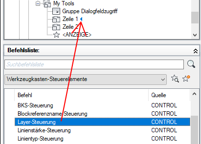 - Ziehen Sie ein Steuerelement aus der Befehlsliste in eine Zeile in der Multifunktionsleisten-Gruppe.