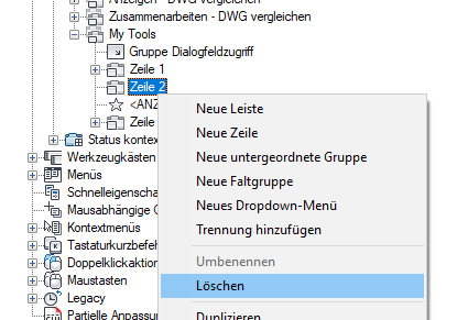 Achtung: Es gibt keine Möglichkeit, das Entfernen einer Multifunktionsleisten-Gruppe rückgängig zu machen. Wenn Sie die falsche Multifunktionsleisten-Gruppe entfernen, klicken Sie auf Abbrechen, um den CUI-Editor zu schließen und die vorgenommenen Änderungen zu speichern. Dadurch gehen jedoch alle anderen möglicherweise vorgenommenen Änderungen verloren.